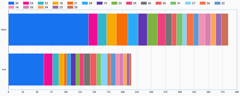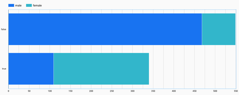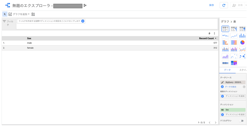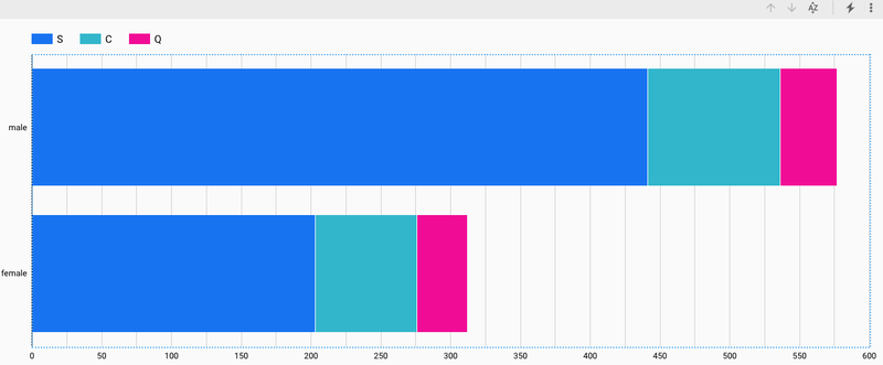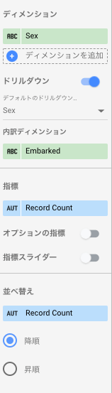 先ほどのグラフでは、ディメンションにSexが指定され、指標にRecord Count(レコード数)、内部ディメンションとしてEmbarkedが設定されているので、横棒の長さは性別ごとのレコード数の合計、横棒の内訳は乗船した港で区分されています。