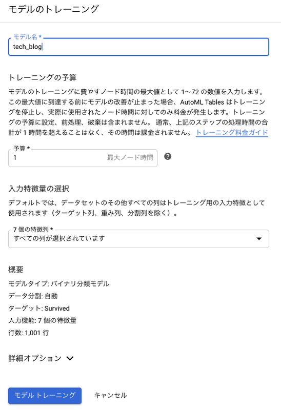 以上で、設定は完了です。「モデルトレーニング」をクリックすると、開始の確認画面が出ますが、予算に「1」を設定して、トレーニングを開始します。この数字についてはデータ量に応じたおよその目安を右側の「?」マークから確認できます。