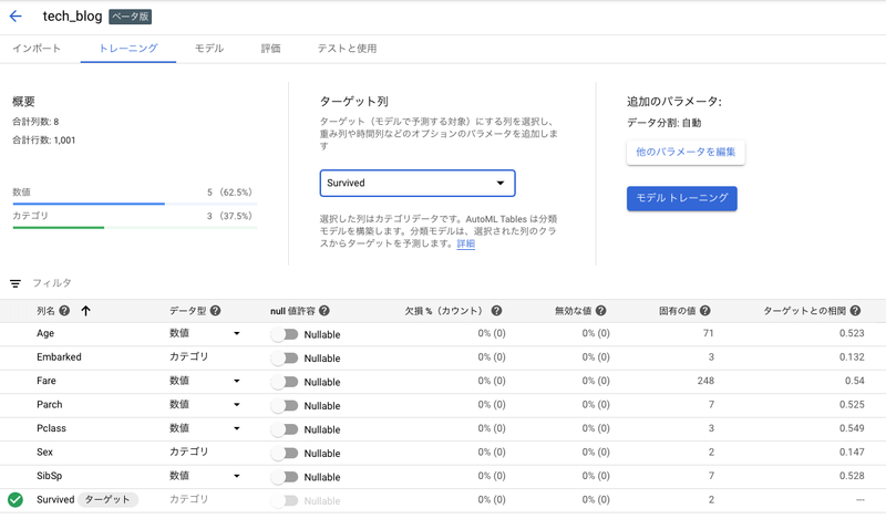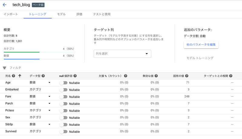 無事にレコードが追加されたのを確認しましたら、再度AutoML Tablesの画面に戻ってください。