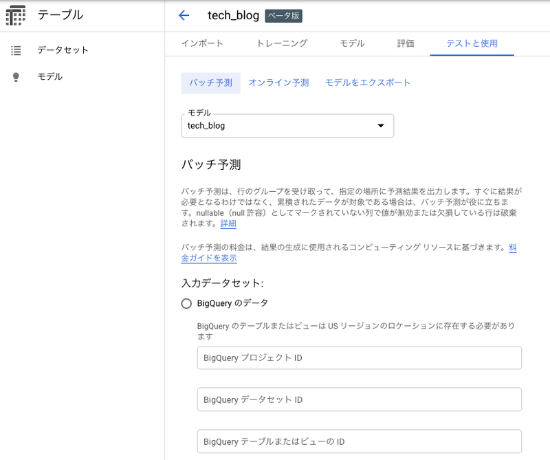 「バッチ予測」を選択し、学習時と同様に、今度は予測用データと出力先のBigQuery 各IDを入力します。