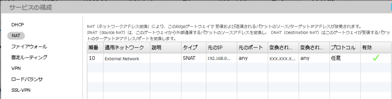 画像にも記載がある様に、DHCP, NAT, ファイアウォール, 固定ルーティング, VPN, ロードバランサ, SSL-VPNの設定ができます。今回の場合、社内ネットワークから開発環境にアクセスする想定なので、開発用サーバが必要なソフトウェアライブラリをインターネット上から取得できる様に、外向きの通信を許可するファイアウォールルールとNATの設定を行っています。