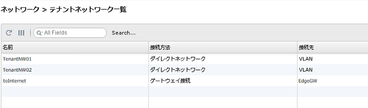 VXLANタイプのネットワークはお客様が自由に作成できるネットワークで、名称は自由に決めて頂くことができます。ここでは、toInternetという名前で作成しています。今回はインターネットへ出るための経路として作成しているので、ソフトウェアファイアウォールに接続しています。上の画像だと、接続方法がゲートウェイ接続、接続先がEdgeGWとなっているネットワークです。EdgeGWとはエッジゲートウェイと読み、ASPIRE上でのソフトウェアファイアウォールの事です。