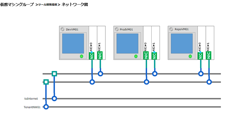 ここで仮想マシングループを定義してから、各ネットワークや仮想マシンをグループ内に設置します。ここではツール開発環境という仮想マシングループを作成しています。