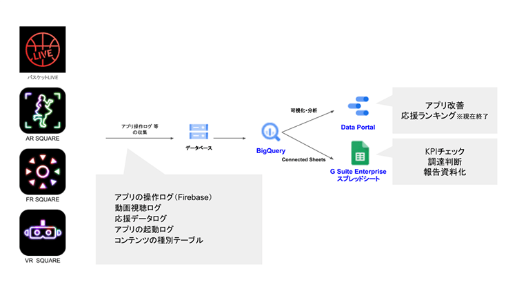アプリログをデータベースに格納し、BigQuery でクエリ実行、Data Portal とスプレッドシート で可視化を行っています。データ処理を自動化することで作業リソースを大幅に削減することができました。