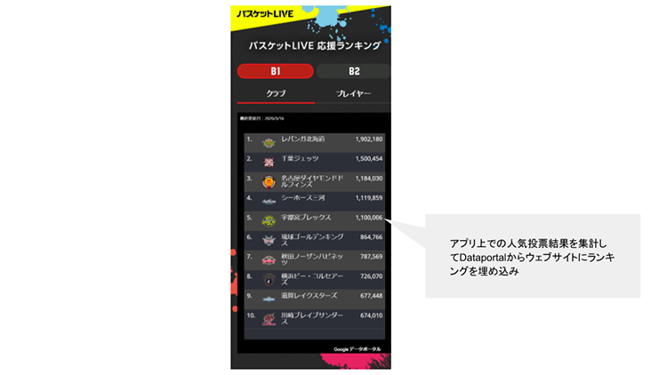 Data Portal では、HTMLのiframe埋め込みを利用してレポートをウェブサイトに埋め込むことができます。以前、視聴者による人気投票を行った際は、BigQuery 上で投票の集計を行い、Data Portal 上でランキング形式のレポート作成しウェブサイトへ埋め込みました。