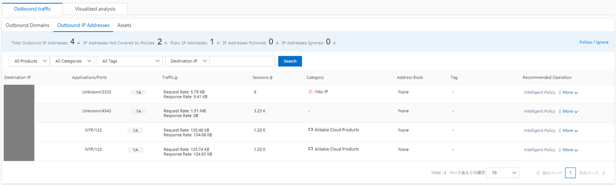 外部ドメイン、外部IPアドレス、外部接続のアセットリクエスト、関連プロトコル、外部接続データなどの情報を表示します。