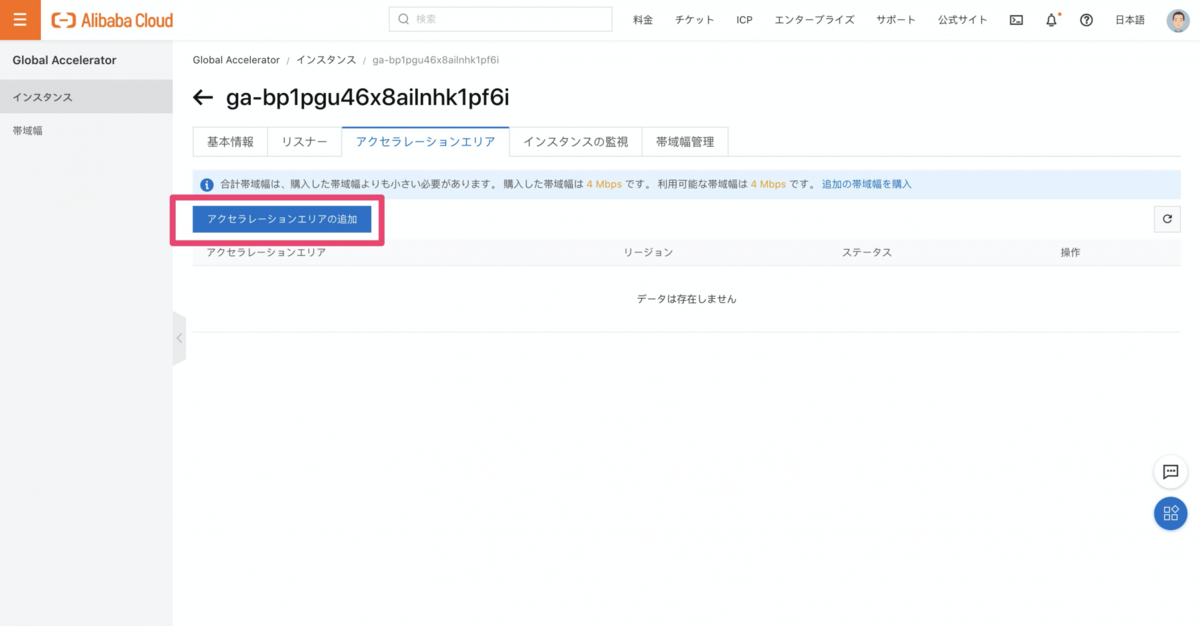 インスタンスの設定画面から、「アクセラレーションエリアの追加」をクリック