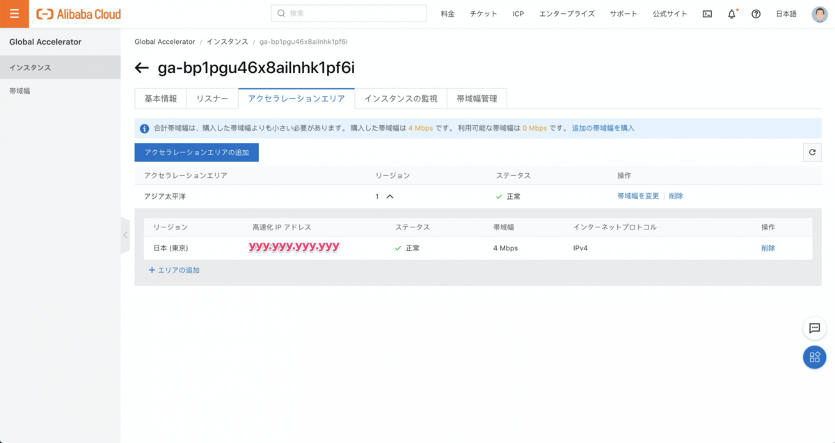 しばらくすると、 高速化IPアドレスが作成されます。