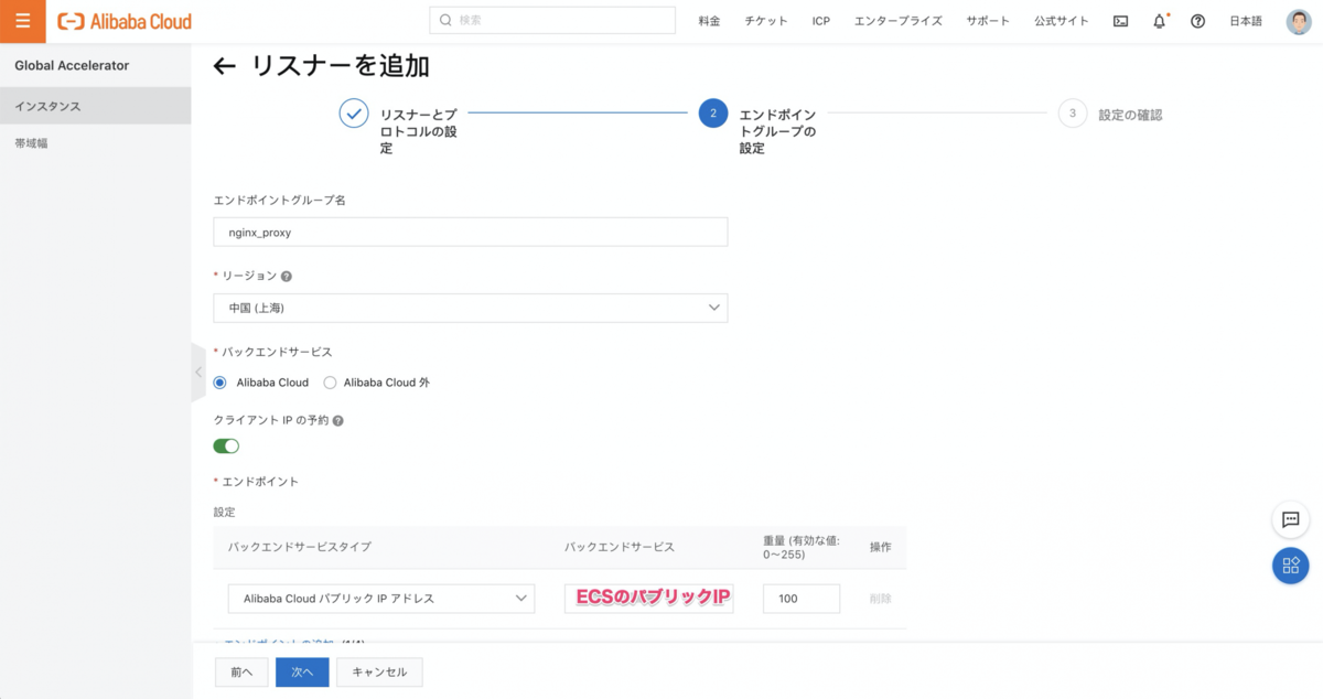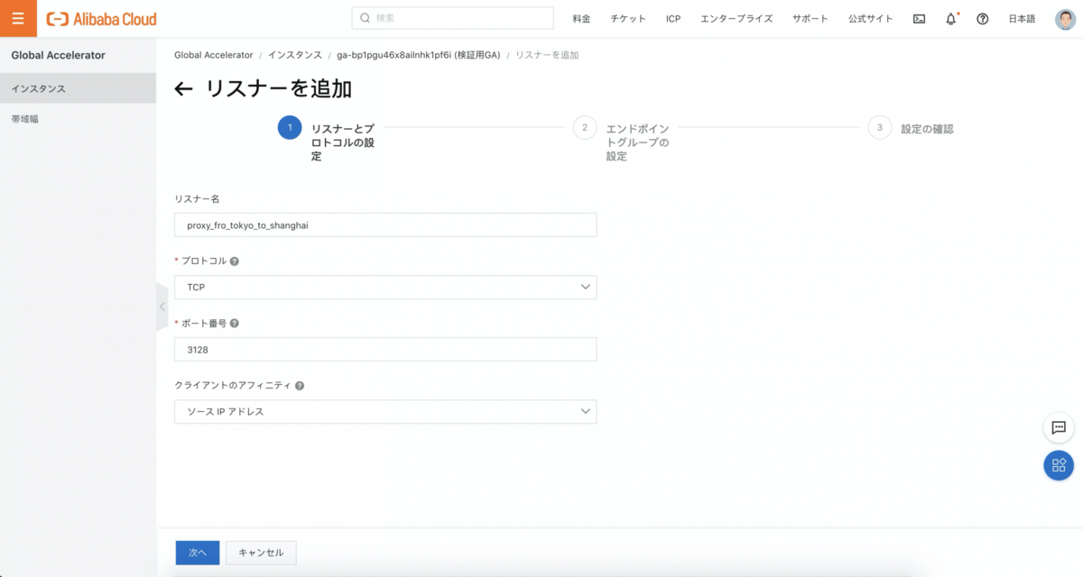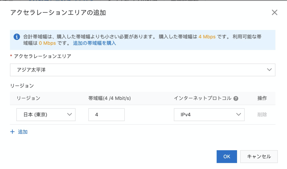 今回は日本から中国のFoward Proxyにアクセスするため、アクセラレーションエリアは「アジア太平洋」を選択、リージョンは「日本(東京)」を選択。