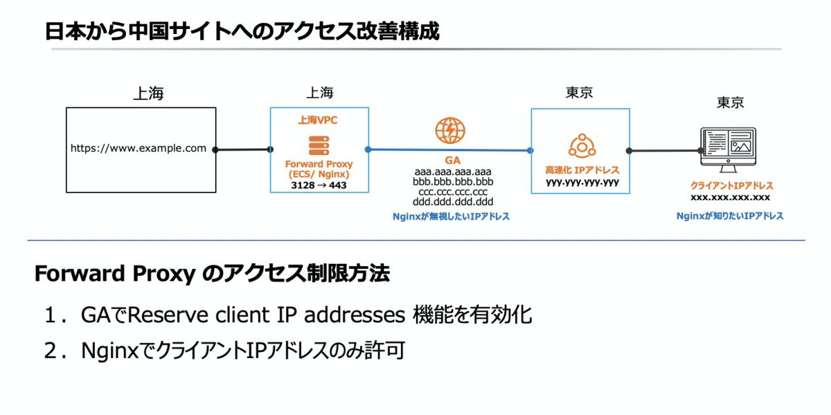 苦慮したのは、どのようにForward ProxyでクライアントIPアドレスのみアクセス許可をするかでした。