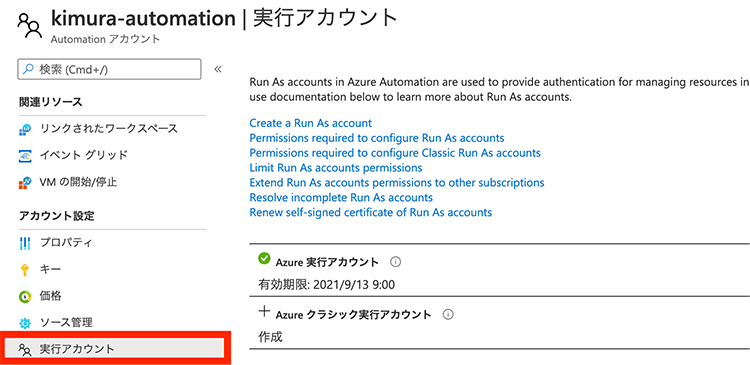 第2章で解説した通り、「Azure Automation」では、実行アカウントというアカウントを発行してAzureリソースに対する認証を行います。この実行アカウントについて、以下の2点に注意する必要があります。