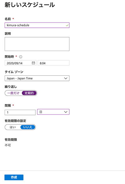 ②「新しいスケジュールを作成します」を選択し、スケジュールの名前や実行時間などを設定し、「作成」をクリックします。