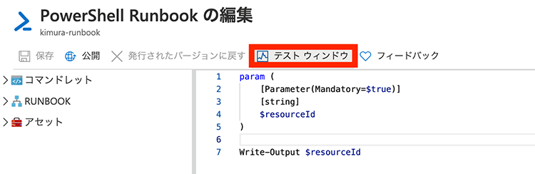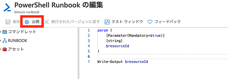 ⑤テストが完了したら、テストのブレードを閉じます。最後に、ランブックの編集ページにて、「公開」をクリックすることで、スクリプトを公式バージョンとして登録します。
