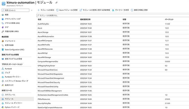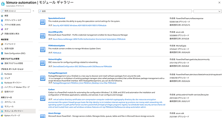 「Azure Automation」では、PowerShellのモジュールをオートメーションアカウントごとに管理します。作成したオートメーションアカウントでは、あらかじめ標準的なPowerShellのモジュールがすでに導入された状態になっています。必要に応じて、モジュールの追加を行います。