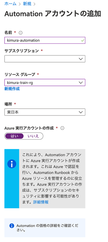 「Azure Automation」では、Azureに対する操作を行うために、実行アカウントというAzure操作用のサービスプリンシパルを利用します。オートメーションアカウントと実行アカウントを同時に作成するために、実行アカウントの作成は「はい」を選択します。