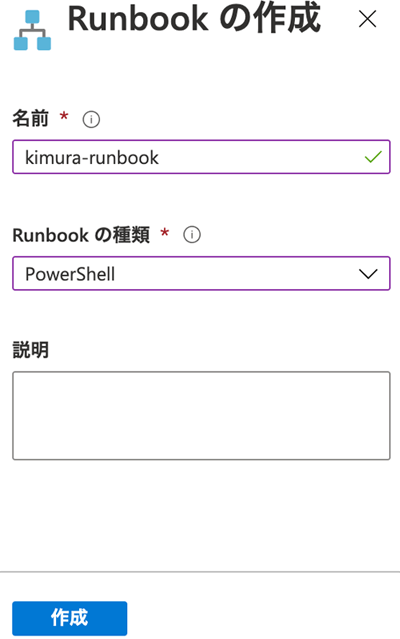 ② ランブックの名前を入力し、「Runbookの種類」はPowerShellを選択し、「作成」をクリックします。