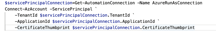 以下のコードを利用することで、実行アカウントのサービスプリンシパルの情報を取得し、Azureに対して認証を行うことができます。