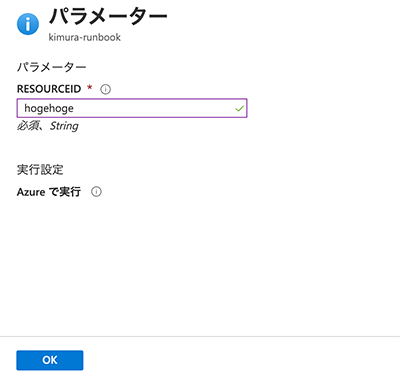 ③ 「パラメータと実行設定」を選択し、ランブックに渡す可変値を入力し、「OK」をクリックします。