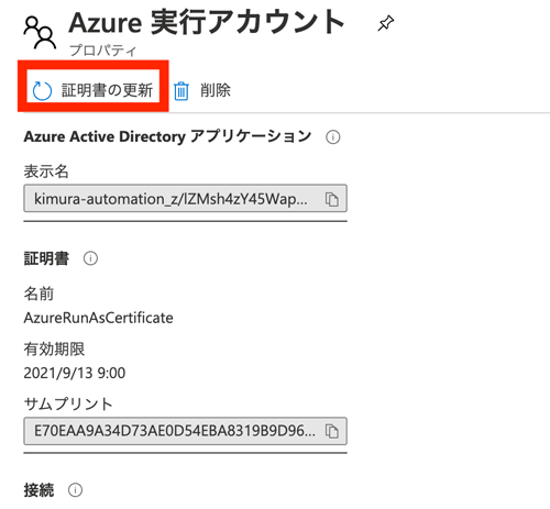 証明書の更新は、該当のオートメーションアカウントの「実行アカウント」のメニューから実施できます。