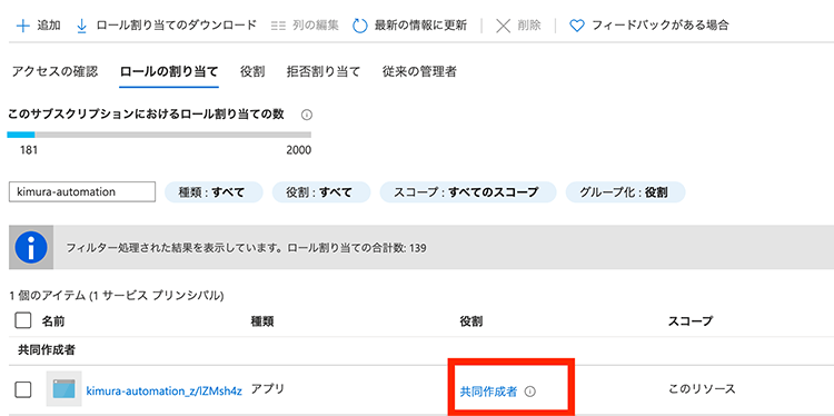 権限の設定については、該当のサブスクリプションの「アクセス制御 (IAM)」のページから、ロールの割り当てと削除ができます。