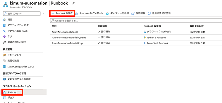 ① 「Runbook」メニューを選択し、「Runbookの作成」をクリックします。