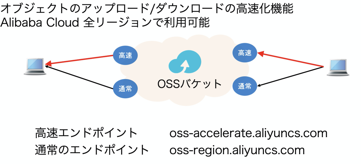 簡単に説明すると、OSSバケットへのアップロードやダウンロードを高速化する機能です。