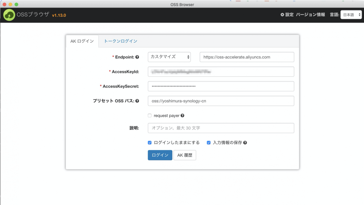 また、OSSブラウザ で Transfer Acceleration を利用する際に悩ましい点は、プリセットOSSパスで対象バケット1つを指定してOSSブラウザにAKログインする点です。