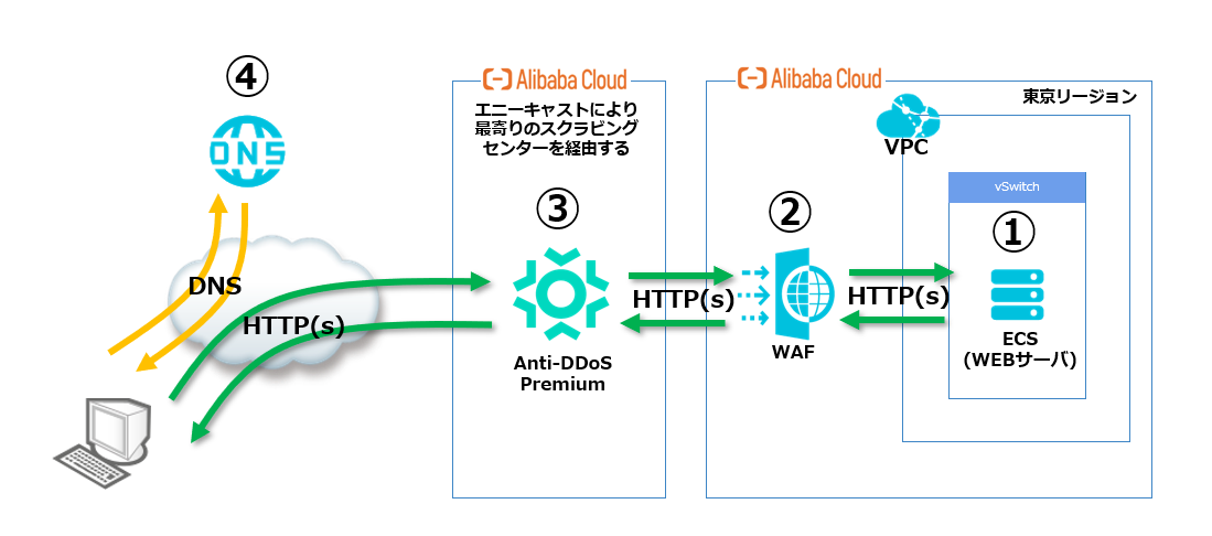 今回の構成です。①~④はインスタンスデプロイの順番です。ECS、WAFは購入済みの段階から説明しますので、②の途中から進めていくことになります。ECSとWAFは東京リージョン。Anti-DDoS premiumはエニーキャストにより、クライアントから最寄りのインスタンスを経由するため、リージョンという考えはありません。
