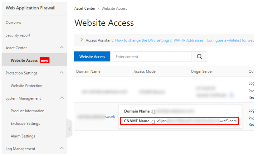 Website Access > 対象ドメインにカーソルを合わせるとCNAMEが表示されます。