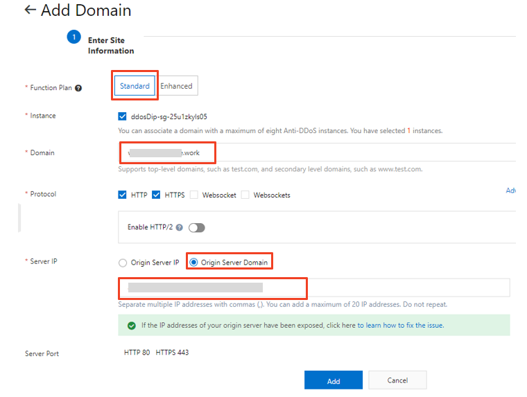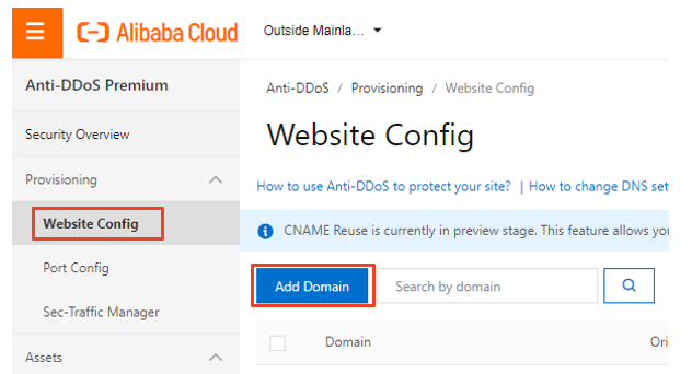 3-1 Anti-DDoS Premiumコンソールにて、Website Config > Add Domain をクリックします。
