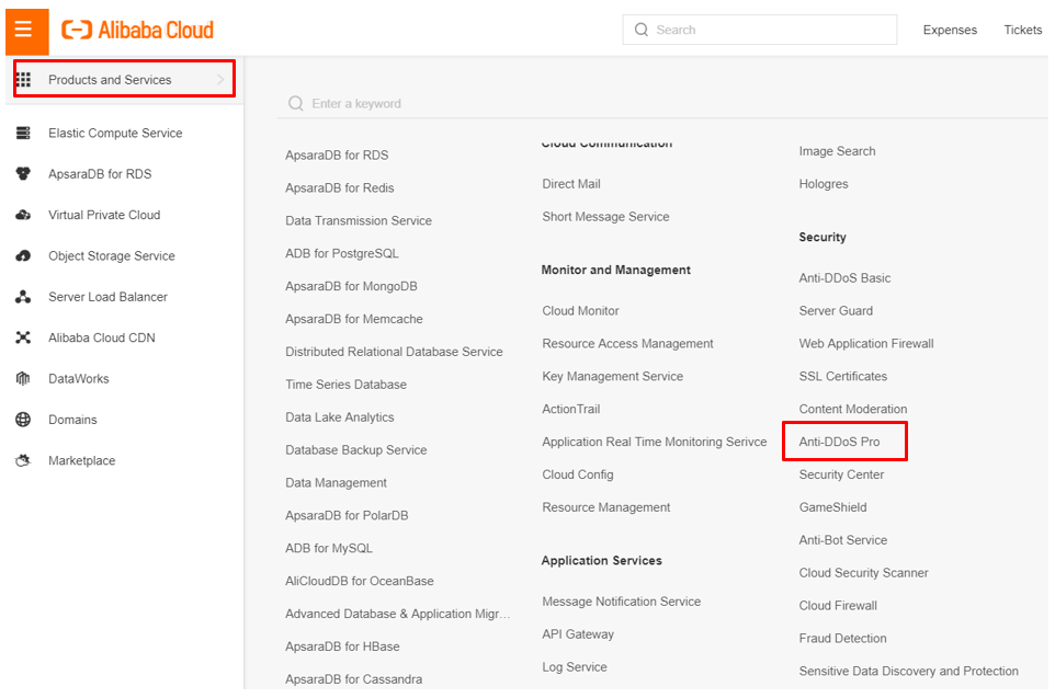 2-1 AlibabaCloudコンソールより、Products and Service > Anti-DDoS Proを選択します。