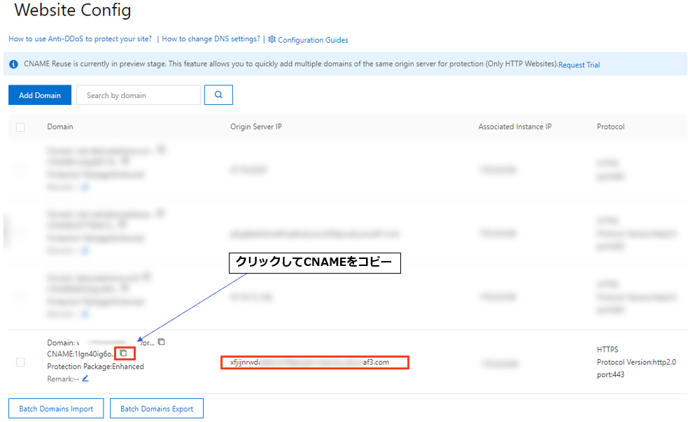 1-4 設定が完了したらドメイン一覧より対象のCNAMEをコピーしておきます。