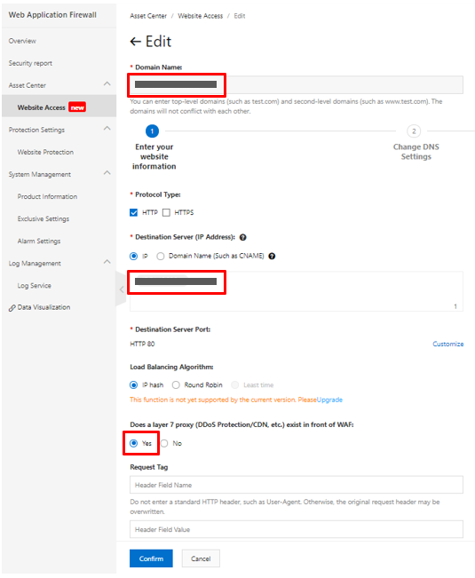 1-3 設定画面が表示されますので、ドメインやサーバのIPアドレスを入力していきます。 IPアドレスはECS(WEBサーバー)のIPアドレスです。 今回はWAFの前段にAnti-DDoSが置かれますので、最下段の"Does layer7 proxy exist in front o f WAF"はYESにすることがポイントです。