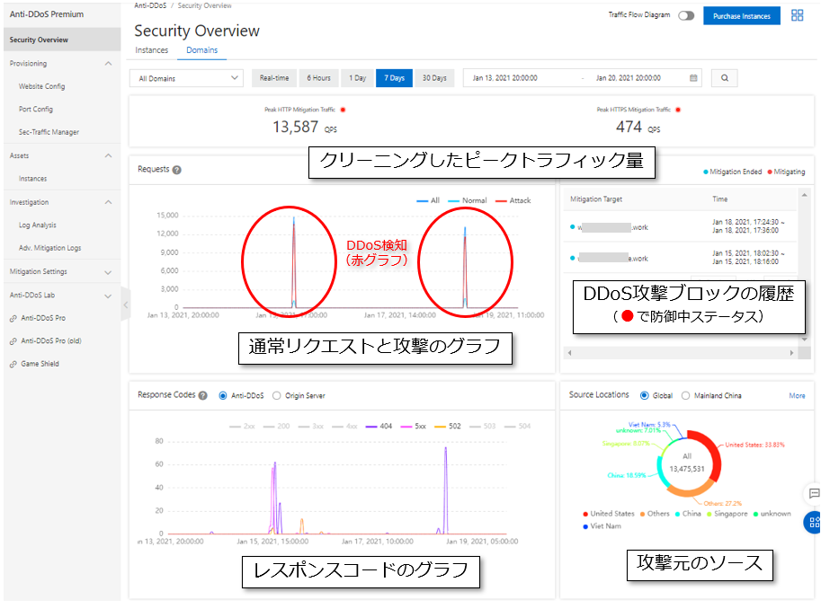 AlibabaCloud WAFはデフォルトでAnti-DDoS Basicが有効になっています。Anti-DDoS Basicでは、トラフィッククリーニングに加え、ブラックホール機能(※)により、Alibaba Cloud全体を保護しています。このブラックホール機能ですが、閾値を超える量の攻撃を受けると発動し、WEBサイトへのアクセスそのものを止めるという仕様になっています。ユーザ側でブラックホール状態の解除や、Anti-DDoS Basicの無効化はできないため、もしブラックホール機能が発動した場合は解除されるまで待つしかありません。