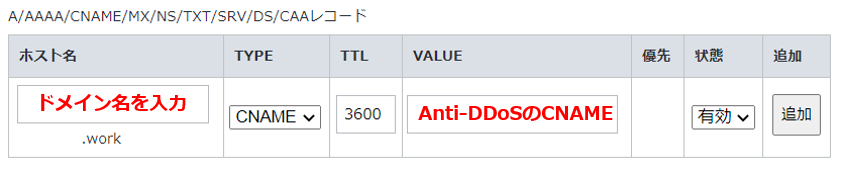CNAMEにはAnti-DDoS Premiumで発行されたCNAMEを登録します。