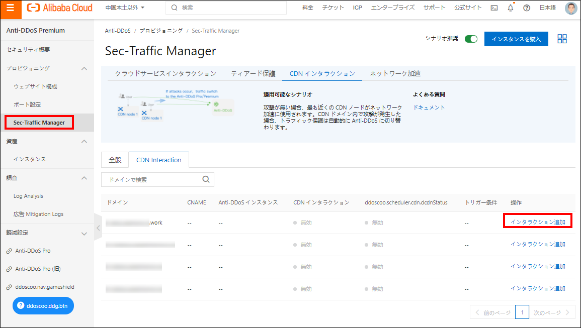 【Anti-DDoS Premium設定】Sec-Traffic Manager > 設定するドメインの右側、インタラクションの追加をクリックします。