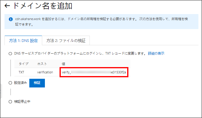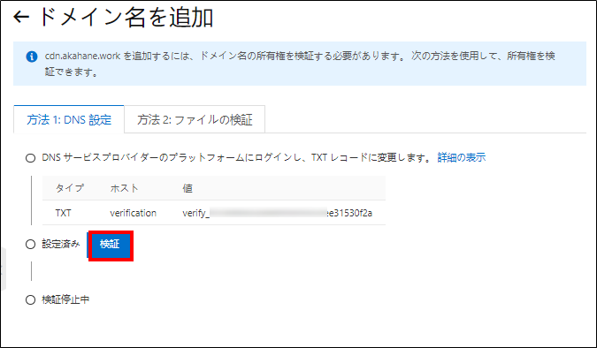 【CDN設定】 この画面でドメイン検証用としてTXTレコードが払い出されます。ご利用のネームサーバにTXTレコードとして登録することで、ドメイン検証がされる仕組みになっています。
