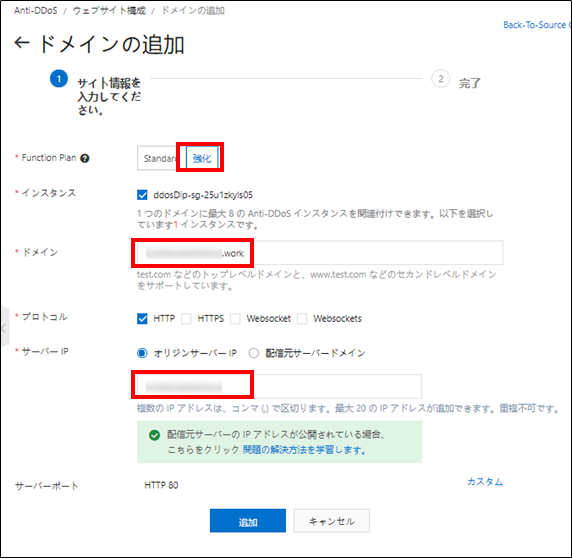 【Anti-DDoS Premium設定】Function PlanはEnhanced(強化)を選択。ドメインとサーバIPにそれぞれ入力して追加ボタンをクリック。プロトコルはオリジンサーバが対応しているプロトコルを選択してください。