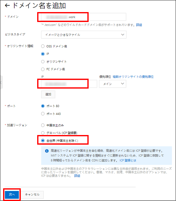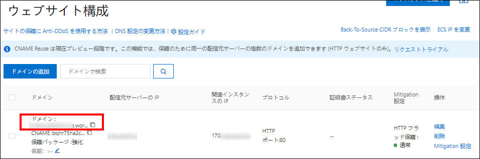 1.Alibaba Cloud CDNにドメイン登録をする(ECSのIPアドレスを登録)