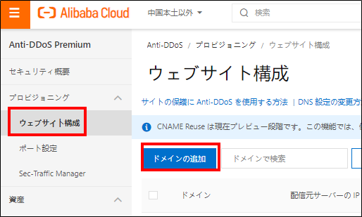 【Anti-DDoS Premium設定】Anti-DDoS Premiumコンソール > ウェブサイト構成 >ドメインの追加をクリック