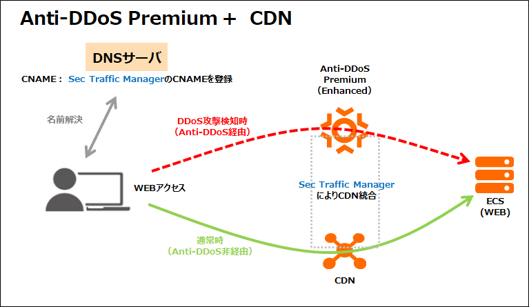 CDNと組み合わせる場合はAnti-DDoS Pro/PremiumのEnhancedプラン(強化プラン)が必要です。 またDNSで通信先をコントロールする仕組みなので、クライアントからIPアドレス指定でアクセスさせるような構成には使えません。