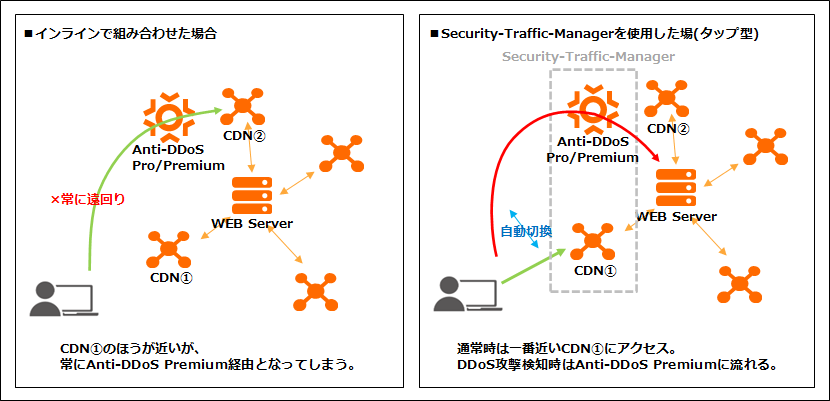 Security-Traffic-ManagerとはAnti-DDoS Pro/Premiumの機能の一つで、DDoS攻撃有無に応じてトラフィックの経路をコントロールしてくれるものです。通常、Anti-DDoS Premiumを導入すると、すべてのトラフィックはいったんAnti-DDoSインスタンスを経由してから、オリジンサーバへ流れます(インライン型)。シンプルな構成となりますが、例えばCDNをインライン型でAnti-DDoS Premiumと組み合わせた場合、クライアントによっては常に遠回りの経路となり、パフォーマンスが低下する可能性があります(図1参照)。Security-Traffic-ManagerでAnti-DDoS PremiumとCDNを統合させることにより、通常時は最寄りのCDN経由、DDoS攻撃検知時はAnti-DDoS Premium経由、というように振り分けることができます(タップ型)。