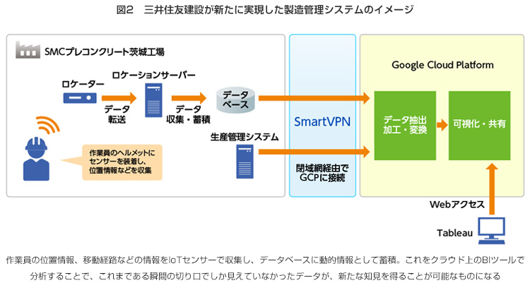 GCP上に構築したデータ分析環境は、2020年秋から稼働を開始。茨城工場におけるIoTデータの収集・蓄積・活用を支えている。先に紹介した通り、工場内における作業員の位置情報や移動経路などをセンサーで可視化し、生産管理システム内の様々なデータと組み合わせて分析する。これにより、プレキャストコンクリート部材の生産プロセスに潜む非効率な手作業や重複管理している課題点を抽出し、解決につなげる狙いだ(図2)。