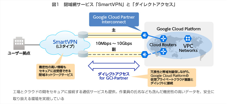また、データ自体を保管する工場内環境とクラウドとの接続には、ソフトバンクが強みとするネットワークソリューションを適用。閉域ネットワークサービス「SmartVPN」と「ダイレクトアクセス for GCI-Partner」で、機密性の高いデータも安全にやり取りできるセキュアな通信環境を具現化する。これは GCP の世界規模の仮想プライベートクラウド環境「VPC Network」と、冗長性と帯域を確保した閉域接続を可能とするものだ(図1)。