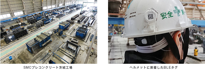 そこで同社は、グループ企業のSMCプレコンクリート茨城工場(写真)において、生産プロセスのデータ化に着手。作業員一人ひとりのヘルメットにセンサーデバイスを装着し、工場内における位置情報、移動経路などのデータを集める。それをBI(Business Intelligence)ツールで分析・活用することにした。