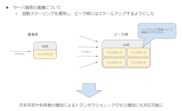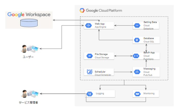 単純にWebサービスの開発を行って展開するだけでは、今まで各社のオンプレミス環境に分散していた負荷がWebサービスへと一極集中するため、インフラやサーバ環境のスペックの検討など、オンプレミス環境への展開ではそれ程意識せずにいた課題が新たに生じます。 そこで、今後の利用者の増減時のサーバのスケールアップ・スケールダウンに対応できるよう、ディスク領域やサーバのスケールアップが容易に可能なApp Engine でのWebアプリケーション開発が展開先としてベターであると判断しました。