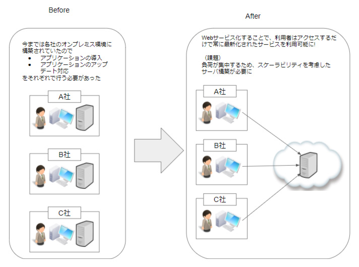 これまでは、サービス利用者がソフトウェアのセットアップやアップデートといった作業を実施する必要があるため、サービス導入までの手間がかかってしまうという悩みを抱えていました。そこで、利用者がWebにアクセスするだけで常に新しいサービスを利用できるようなWebサービスの開発と展開が出来ないか、とご相談をいただいておりました。