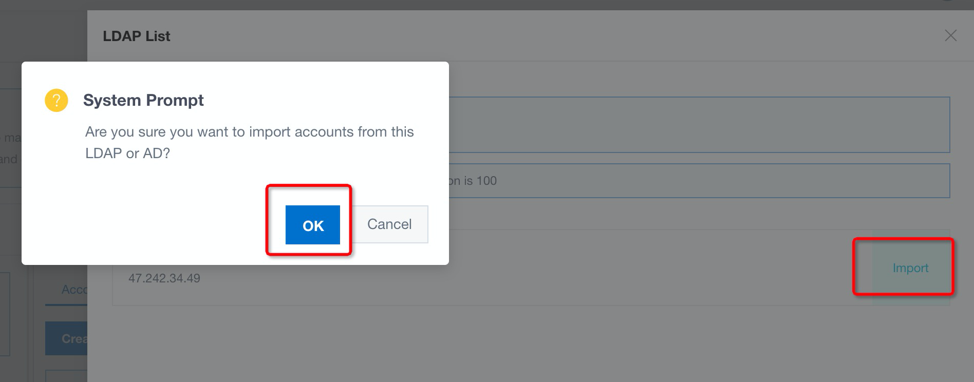 2.先ほど追加した同期先ADサーバ名の右にある「Import」を押下し、表示された画面で「OK」をクリック