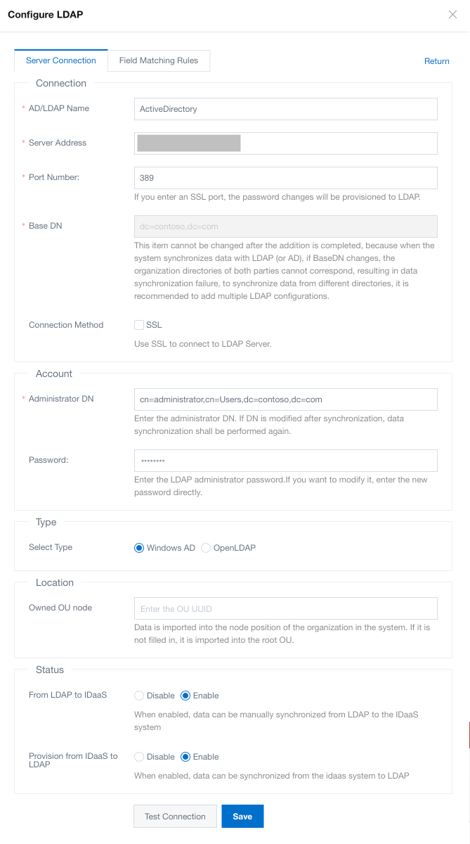 今回はcn=administrator,cn=Users,dc=contoso,dc=com