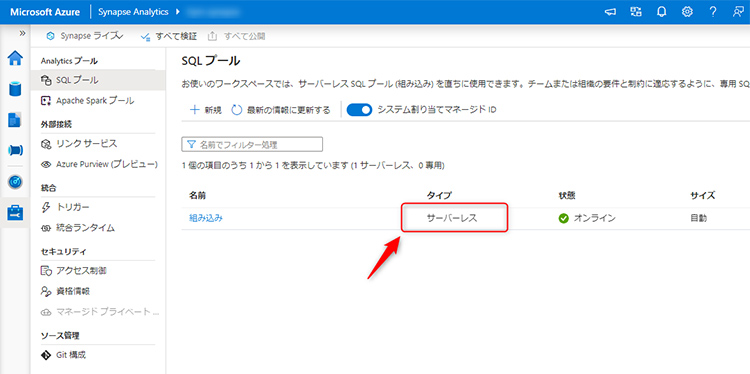ただし前述の通り、専用SQLプールは比較的従量課金額が高額なのでご注意ください。 ワークスペースで利用可能なSQLプールのタイプは以下の通り確認が可能です。